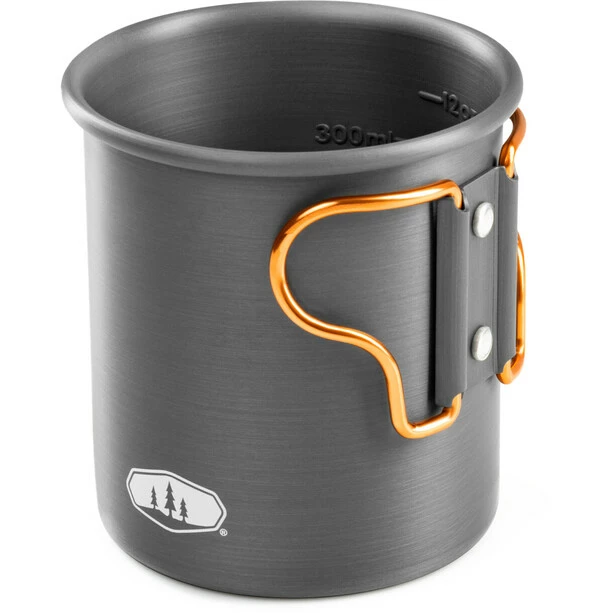 Cup made of aluminium. The handle can be folded away after use to save space.