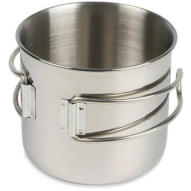The stainless steel cup Handle Mug has folding handle, a volume scale on inside and 0,5 litre capacity. It is tremendously popular with packing experts because it fits perfectly around the classic American Nalgene bottle (1 litre).