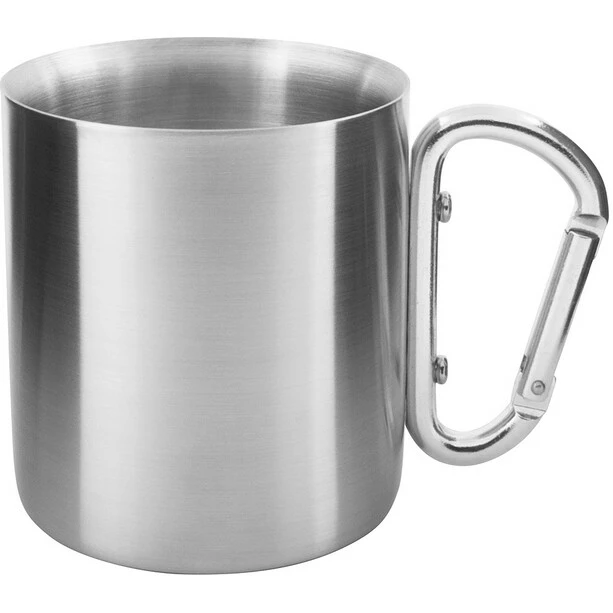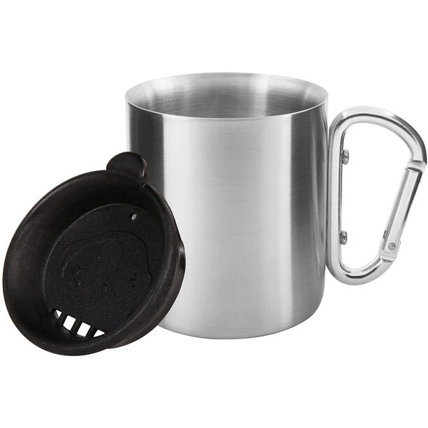 Double-walled stainless steel cup with a lid and handy carabiner grip. 250 ml volume with measurement markings inside.